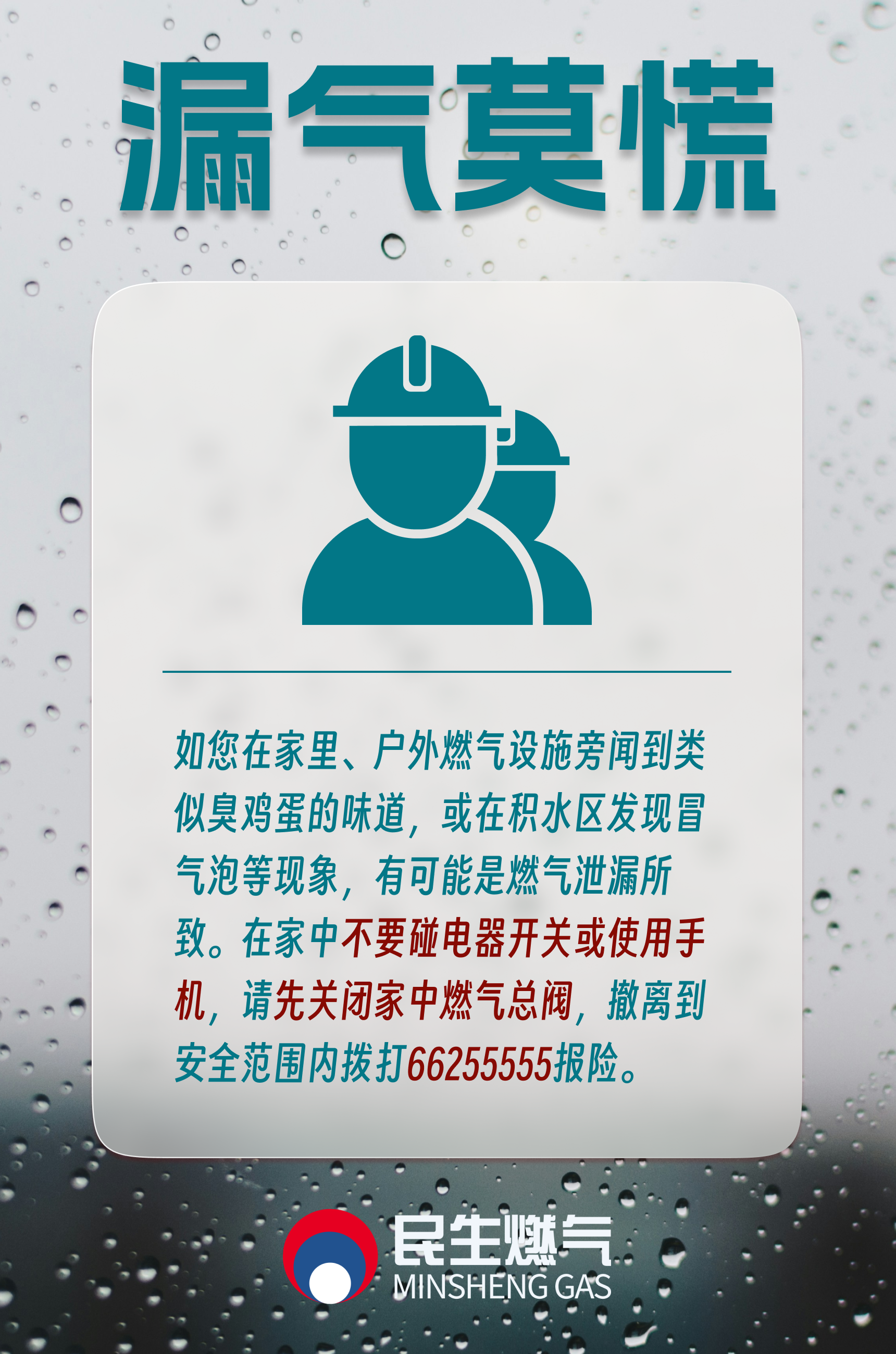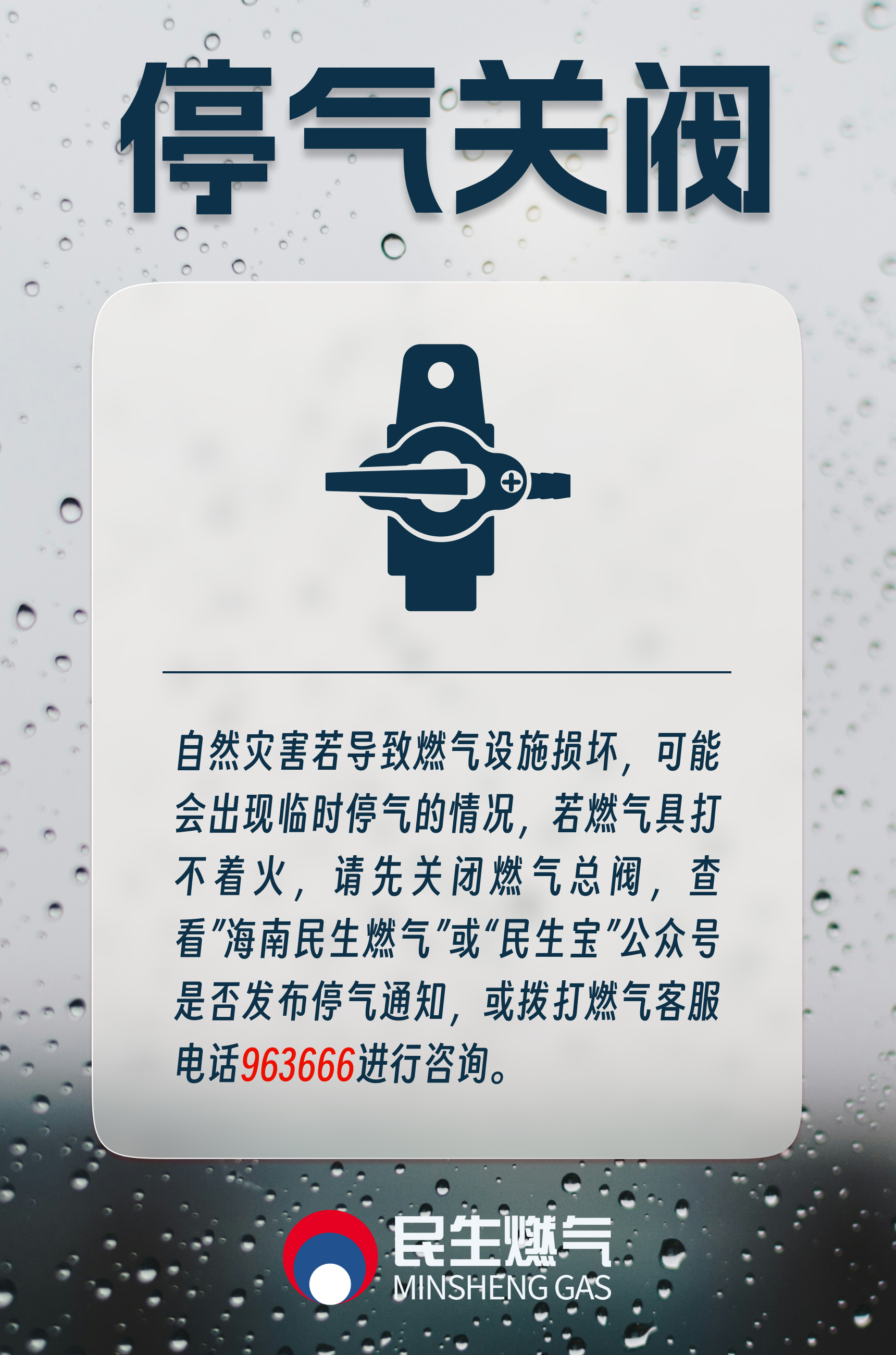 為確保臺風(fēng)期間廣大用戶日常生活用氣需求和用氣安全,海南民生燃氣提醒請您,根據(jù)需求提前做好充值購氣和安全防范。風(fēng)災(zāi)期間一旦發(fā)現(xiàn)用氣異常情況,請立即撥打公司24小時服務(wù)熱線963666或66255555聯(lián)系專業(yè)人員進行維修。